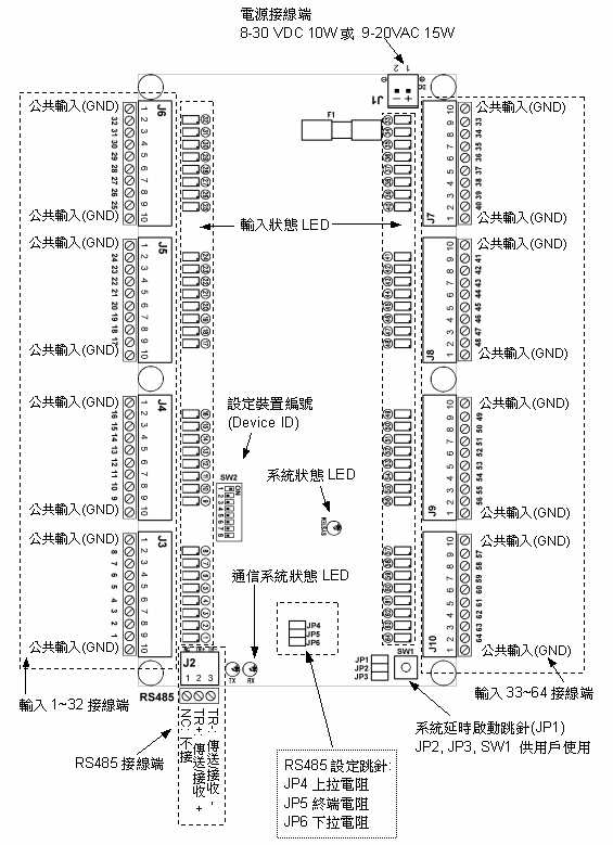64路干接輸入及LED 狀態顯示. (輸入共地)