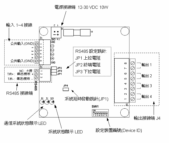 4路干接輸入及LED 狀態顯示. (輸入共地)